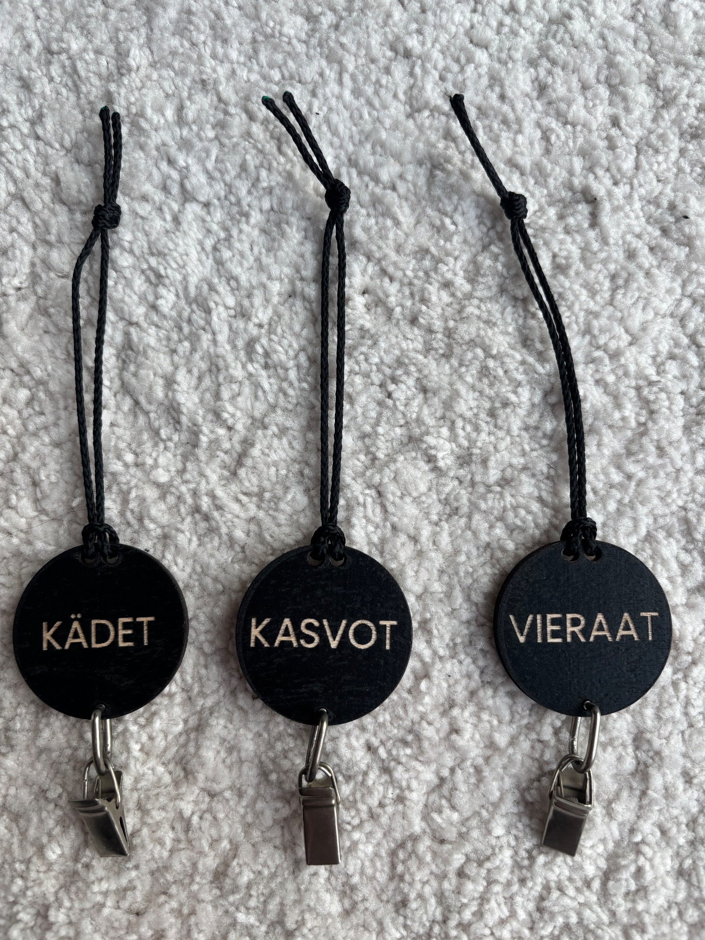 Koivuvanerista valmistetut pyyhenipsut. Maalattu mustaksi.