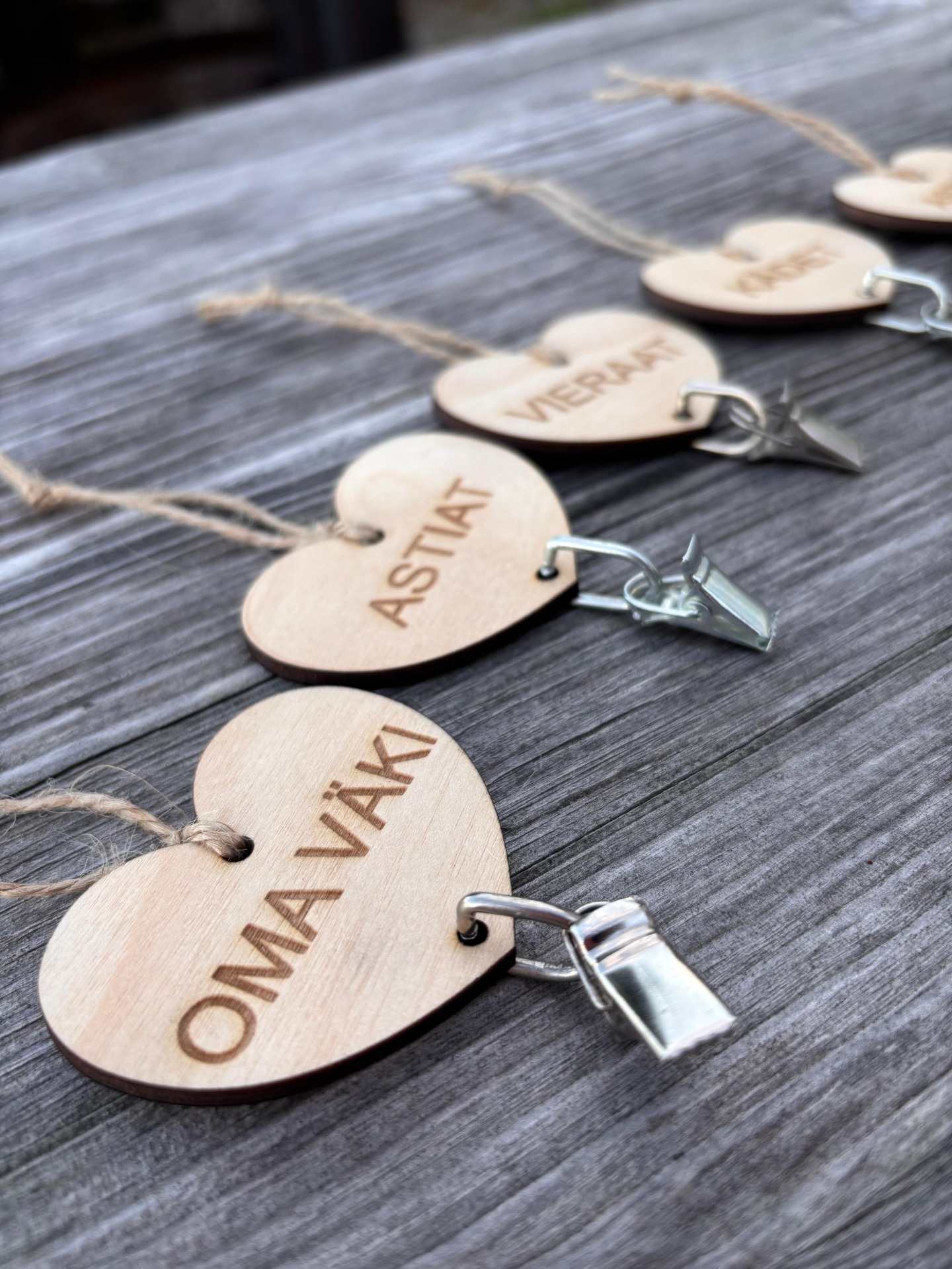 Sydämenmuotoiset pyyhenipsut, tekstit: kädet, kasvot ja vieraat